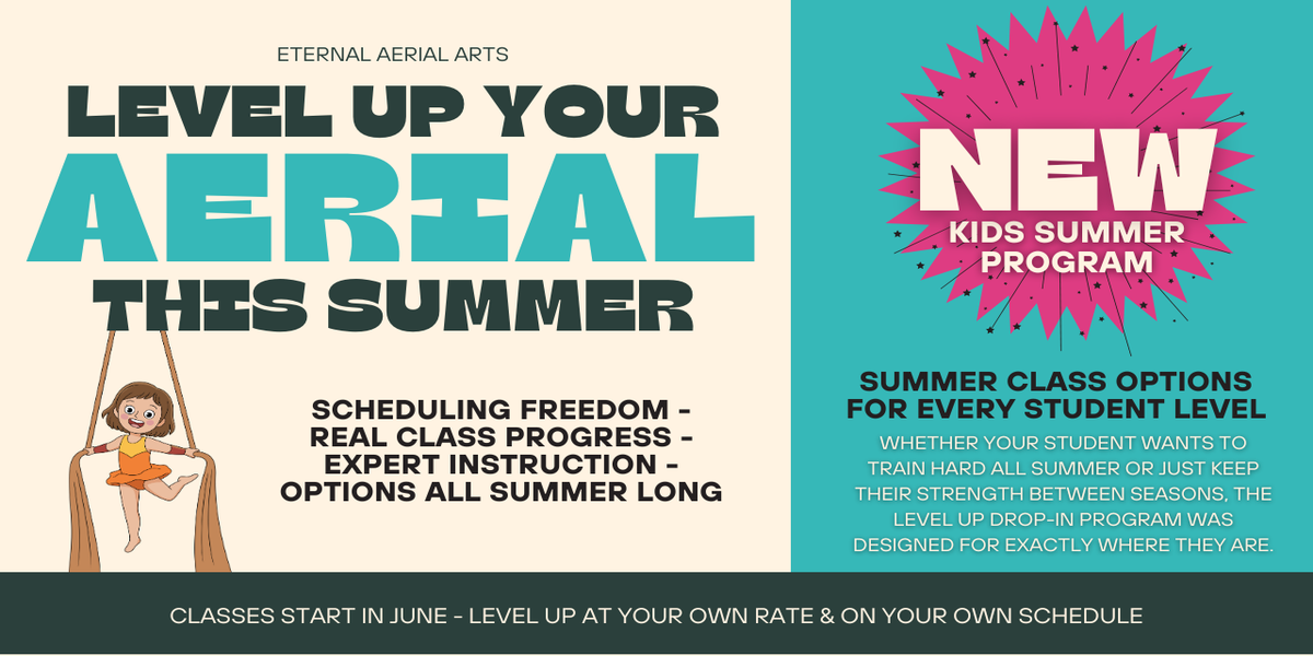 Eternal Aerial Arts is open all summer long — no session or camp registration required. Introducing the Level Up Drop-In Program, where students of all experience levels can drop in at their appropriate color level and work through a real skills checklist at their own pace.