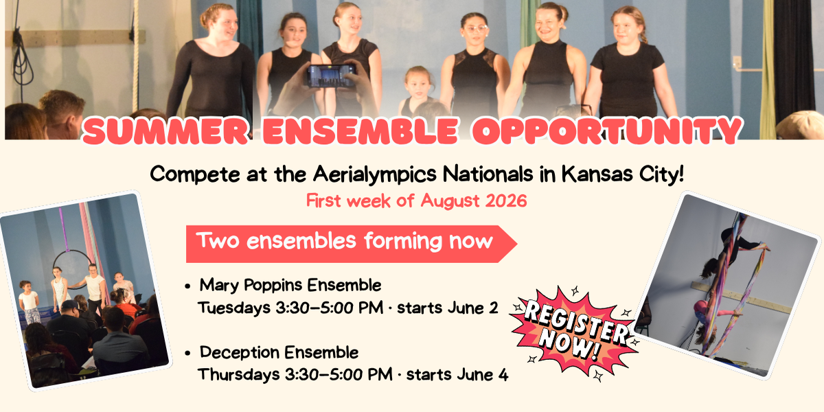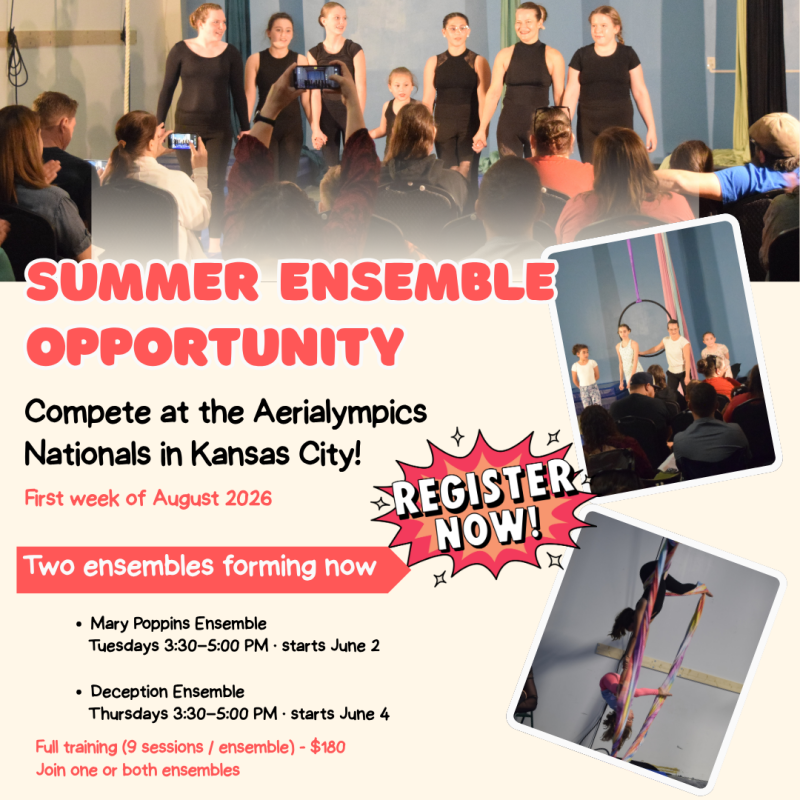 This summer, Eternal Aerial Arts is heading to Kansas City to compete at the Aerialympics Nationals — and we want YOU on the team! We're forming two ensembles open to all students with aerial experience, including adults. Spots are limited, so don't wait to claim yours!